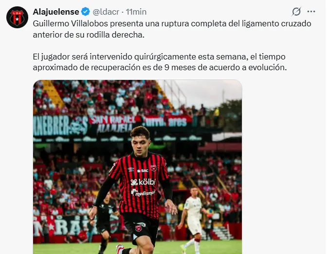 “El jugador será intervenido quirúrgicamente esta semana, el tiempo aproximado de recuperación es de 9 meses de acuerdo a evolución“, publicó Alajuelense a través de sus redes sociales sobre el tiempo que deberá estar fuera de las canchas Villalobos.