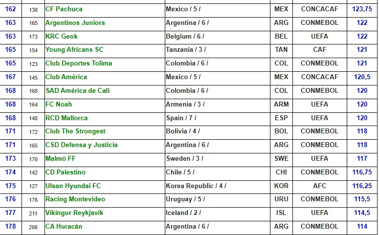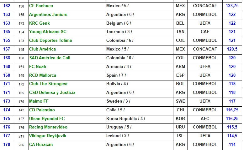 Por otro lado, ni Pachuca ni León lograron destacarse como los mejores equipos mexicanos según el Ranking IFFHS. Actualmente, Pachuca se posiciona como el club mexicano mejor clasificado en el puesto 162, a pesar de que no está viviendo su mejor momento en la Liga MX, donde ocupa el séptimo lugar en el Clausura 2025.