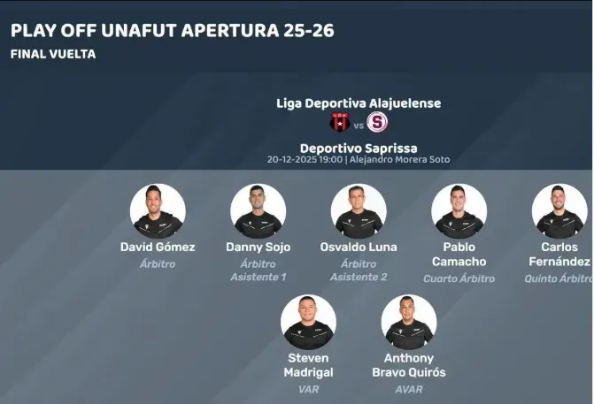 La Unafut, a falta de más de 24 horas para la final de vuelta, confirmó a los árbitros que estarán presentes en la casa de Alajuelense para impartir justicia. El juez principal será David Gómez, quien dirigirá nuevamente un clásico nacional en este Apertura 2025.