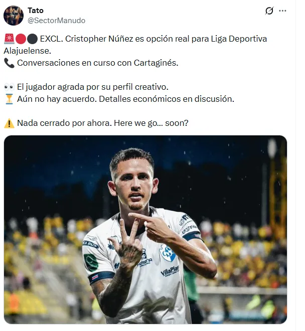Se trata de Cristopher Núñez, quien es una “opción real” según comentó el usuario Sector Manudo en su cuenta de X. Además, explicó que hay “conversaciones en curso” con el Cartaginés. En caso de llevarse adelante, Alajuelense sumaría un gran jugador.
