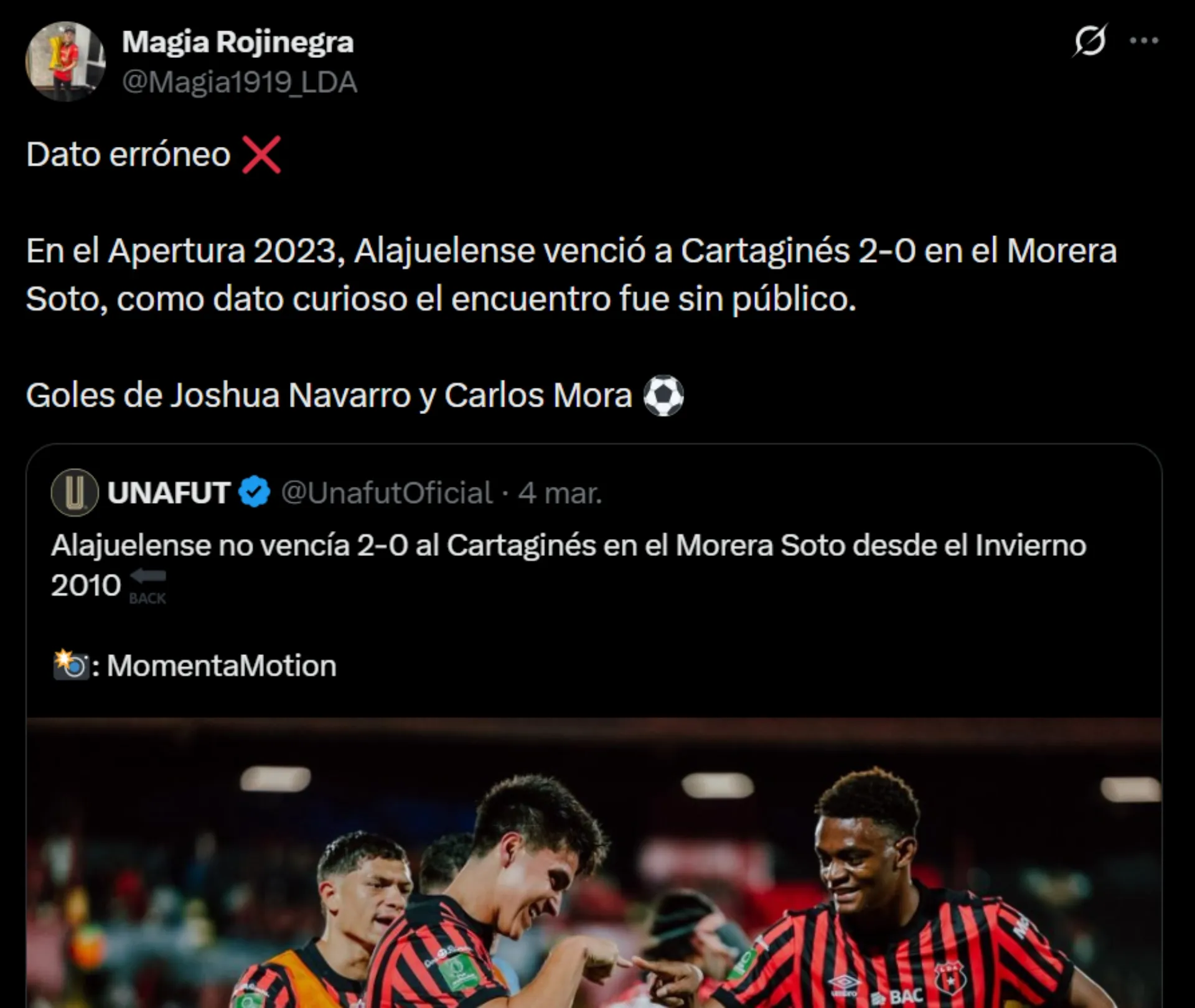 Sin embargo, la afirmación fue rápidamente cuestionada por aficionados manudos. Uno de ellos respondió directamente a la publicación señalando que el dato era incorrecto: “Dato erróneo. En el Apertura 2023, Alajuelense venció a Cartaginés 2-0 en el Morera Soto”.