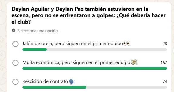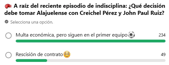 Además, los aficionados rojinegros, a través de una encuesta en el canal de WhatsApp de Fútbol Centroamérica Alajuelense dejaron en claro qué decisión debería tomar el club, según ellos, frente a estos actos de indisciplina.