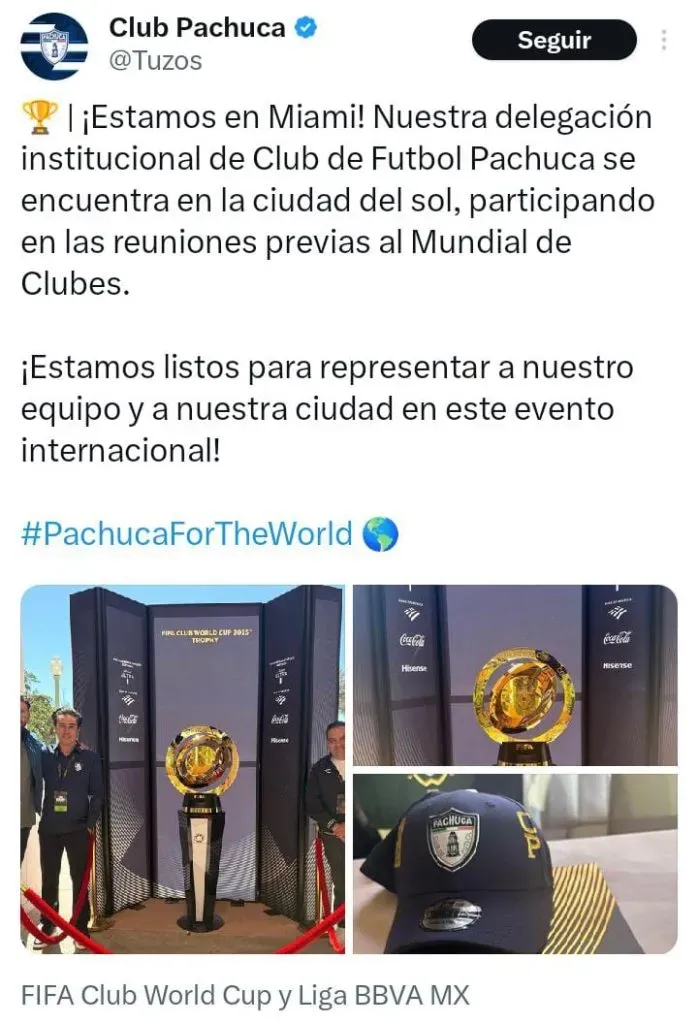 Este martes, Pachuca confirmó a través de sus redes sociales que su delegación institucional, encabezada por el director deportivo, Héctor Lara, se encuentra en Miami, Florida, “participando en las reuniones previas al Mundial de Clubes”.