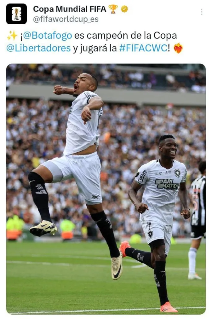 Este sábado, Botafogo derrotó 3-1 a Atlético Mineiro y se proclamó campeón de la Copa Libertadores por primera vez en su historia, obteniendo de esta forma, tal como ratificó la FIFA a través de sus redes sociales, el último lugar disponible para el Mundial de Clubes 2025.