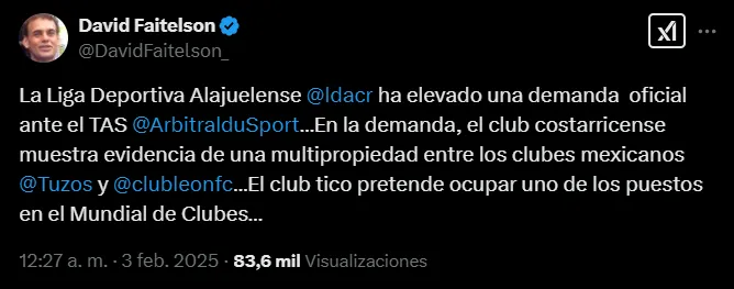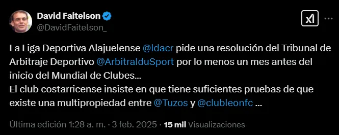 Para ir más allá de sus quejas a través de comunicados, Alajuelense dio un paso más. De acuerdo a la información que dio el periodista David Faitelson a través de su cuenta de X, la Liga ha elevado una demanda al Tribunal de Arbitraje Deportivo (TAS).