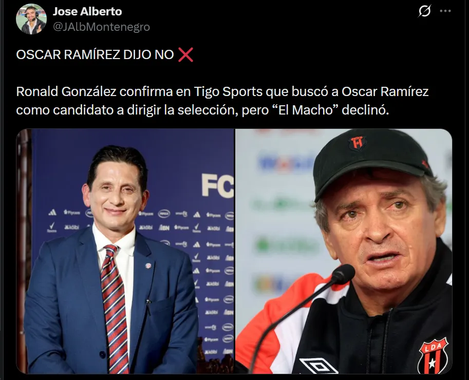 Fue el propio Rónald González quien confirmó la gestión en declaraciones a Tigo Sports. El dirigente reveló que buscó a Ramírez como parte del abanico de opciones que analiza la Federación. Sin embargo, también aclaró que “El Macho” declinó la posibilidad de asumir el reto en esta etapa. La respuesta del técnico cierra, al menos por ahora, cualquier especulación sobre una salida inmediata del Morera Soto rumbo a la Tricolor.