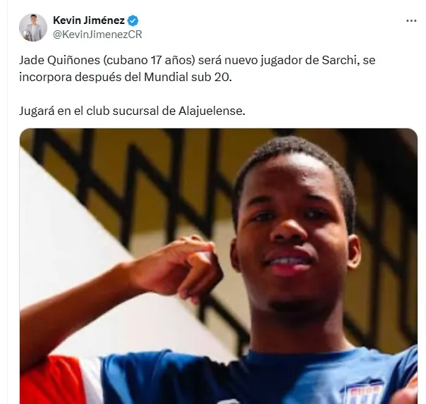 De acuerdo a la información del periodista Kevin Jiménez, Sarchi, club filial de los Manudos, tendrá como refuerzo a Jade Quiñones. Se trata de un futbolista de 18 años que representará a Cuba en la cita mundialista.
