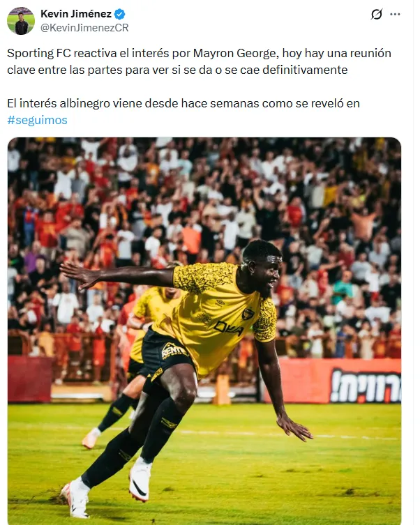 Días atrás, se dio a conocer que Mayron George estaba en la carpeta de Alajuelense para la delantera. El tico, que viene de seis meses sin sumar minutos tras quedar como agente libre, fue sondeado por el equipo manudo, aunque no hubo avances. Ahora, lo quieren del Albinegro.