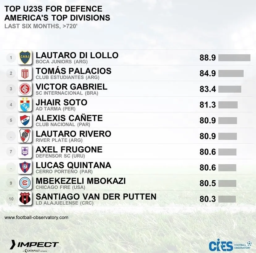 El CIES se basa en los últimos seis meses y en aquellos jugadores que sumaron como mínimo 720 minutos en este período. En el primer lugar, aparece Lautaro Di Lollo, defensor central de Boca Juniors. También aparece segundo Tomás Palacios de Estudiantes y Lautaro Rivero de River Plate en el sexto lugar, quienes fueron convocados a la Selección Argentina.