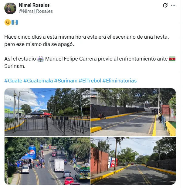 El periodista Nimsi Rosales, a través de su cuenta de X, mostró que las inmediaciones de El Trébol están vacías a falta de cuatro horas para el partido. “Hace cinco días a esta misma hora este era el escenario de una fiesta, pero ese mismo día se apagó“, expresó.