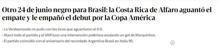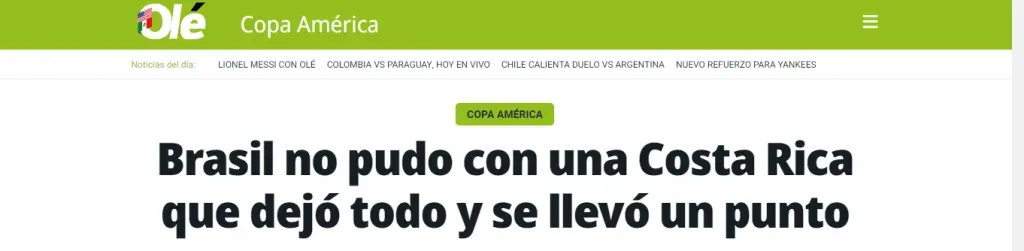 La Selección de Brasil una de las grandes favoritas en esta Copa América 2024, se topó con unaSelección de Costa Rica aguerrida, disciplinada y efectiva que, a pesar de ser superado en posesión y ocasiones de gol, logró rescatar un empate sin goles que deja un sabor amargo entre los aficionados brasileños y llena de ilusión a los ticos. De esta manera reaccionó la prensa internacional tras este histórico punto de los costarricenses.