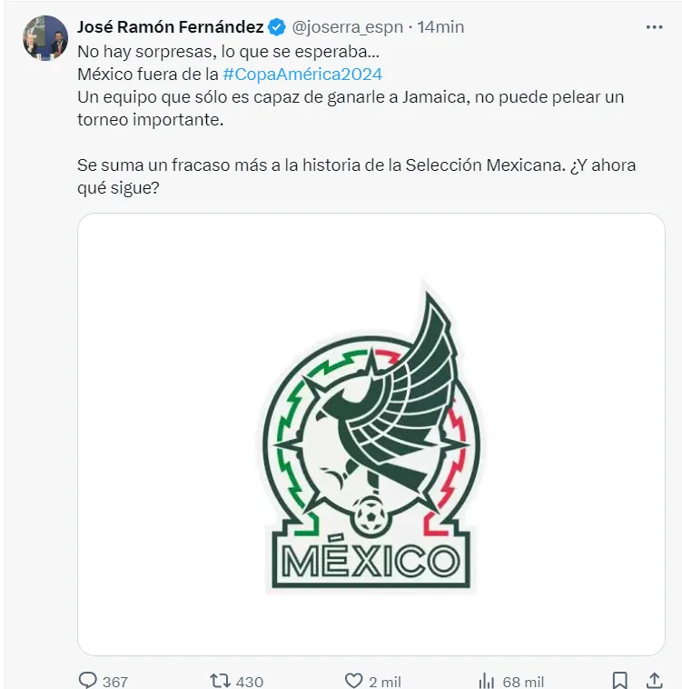 La Selección de México consumó su fracaso en la Copa América 2024 luego de empatar sin goles ante Ecuador en latercera jornada del Grupo B y con esto se despidió de la competición lo que rápidamente ha generado diversos tipos de comentarios, desde burlas a reproches.