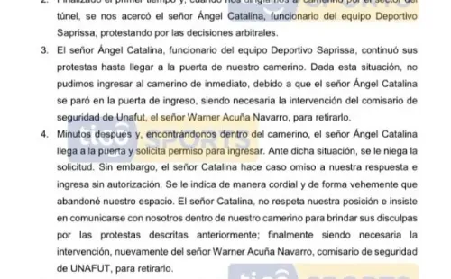 “El señorÁngel Catalina, funcionario del equipoDeportivo Saprissa, continuó con sus protestas hasta llegar a la puerta de nuestro camerino. Dada esta situación no pudimos ingresar al camerino de inmediato, debido a que el señorÁngel Catalinase paró en la ruta de ingreso, siendo necesaria la intervención del comisario de seguridad, el señor Warner Acuña Navarro, para retirarlo”, puntualizó el árbitro.