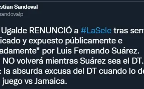 “El día de hoy les escribo para comunicarles que he decidido renunciar a La Selección deCosta Ricamientras el señorLuis Fernando Suárezsea el técnico. Quedar en las gradas para el partido contra Jamaica me dolió, pero es algo que está dentro de las posibilidades.Lo que sí me sorprendió fueron las razones que el señor técnico de la Selección dio públicamente”, fue parte del comunicado que emitió Manfred Ugalde.