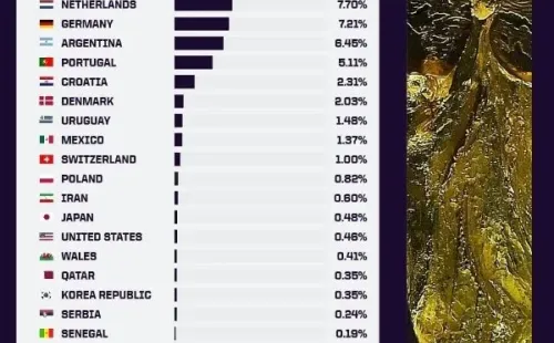 Por otra parte,Francia es la selección con más probabilidades de lograrlo conun 17.93%. En segundo lugar está Brasilcon un 15.73%, tercera Españacon un 11.53%,Inglaterraestá cuarta con un8.03% y de quinta saleBélgica 7.90%. Curiosamente, Argentina no salía en el top de este ranking.