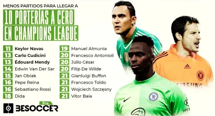 El actual campeón de Europa se quedó con 13 partidos, al igual que el italiano Carlo Cudicini que también jugó para los londinenses, más lejos con 14 está el holandés Edwin Van Der Sar y con 15 el Jan Oblak, todos ellos lejos del costarricense Keylor Navas.