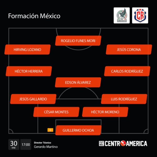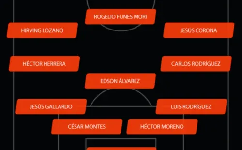 México: Guillermo Ochoa (C); Luis Rodríguez, Héctor Moreno, César MontesyJesús Gallardo; Carlos Rodríguez, Edson Álvarez y Héctor Herrera; Jesús Corona, Rogelio Funes Mori eHirving Lozano.