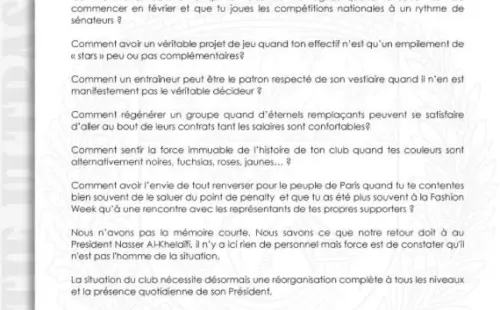 “Sabemos lo que nuestro regreso (entre los grandes) debe al presidente Nasser Al-Khelaifi, no hay nada personal, pero es un hecho que no es el hombre de la situación. La situación del club necesita en adelante una reorganización completa a todos los niveles, y la presencia diaria del presidente”, fue parte del comunicado de los hinchas.