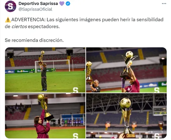 “ADVERTENCIA: Las siguientes imágenes pueden herir la sensibilidad de ciertos espectadores. Se recomienda discreción”, redactó el CM de los de Tibás, acompañado de una foto con lasa cuatro copas que se han ganado en las últimas temporadas.
