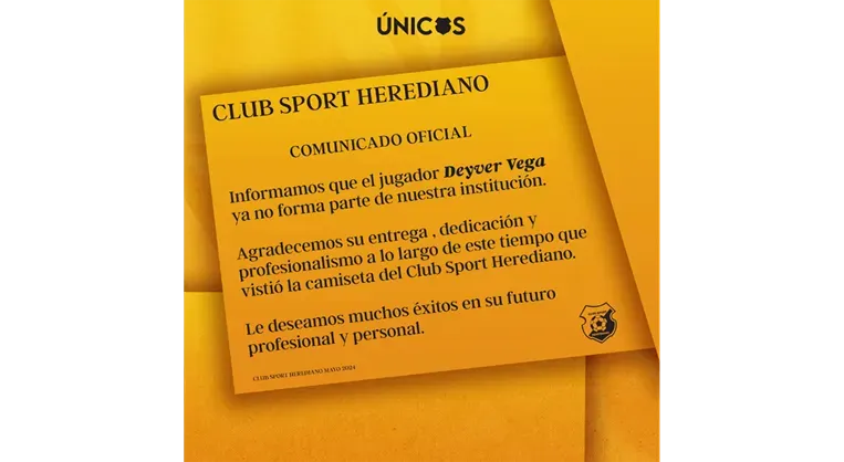 “Agradecemos su entrega, dedicación y profesionalismo a lo largo de este tiempo que vistió la camiseta del Club Sport Herediano. Le deseamos muchos éxitos en su futuro profesional y personal”, señaló el departamento de prensa del equipo a través de sus redes sociales.