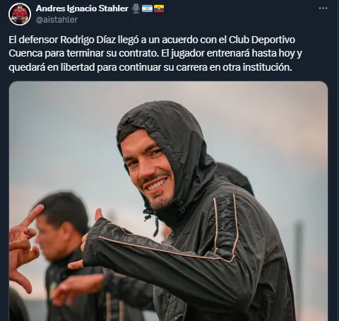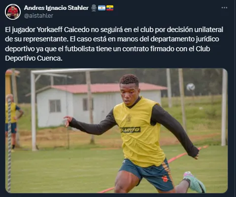 Andrés Ignacio Stahler, comunicador del Deportivo Cuenca, ha confirmado de manera oficial la salida de Yorkaeff Caicedo y Rodrigo Díaz del equipo. “Lamentamos la partida de estos dos grandes jugadores que han dejado una huella importante en nuestra institución”.