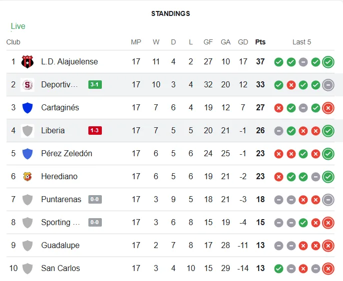 Tabla de posiciones EN VIVO de la Primera División de Costa Rica