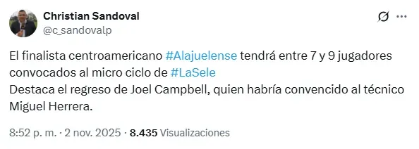 Además de la vuelta de Campbell, el periodista confirmó que el microciclo de La Sele “tendrá entre 7 y 9 jugadores” de Alajuelense, que actualmente se encuentra en la final de la Copa Centroamericana y en lo más alto del campeonato nacional.