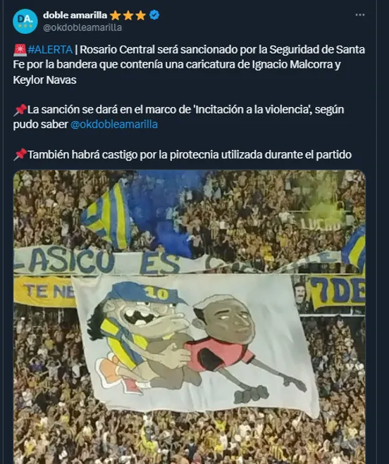 Rosario Central enfrentará una sanción por parte de la Seguridad de Santa Fe tras la polémica bandera exhibida en el partido contra Sarmiento, en la que aparecían caricaturas de Ignacio Malcorra y Keylor Navas. El gesto que surgió como una burla hacia el arquero costarricense y su equipo, generó controversia y llevó a las autoridades a tomar medidas contra el club.