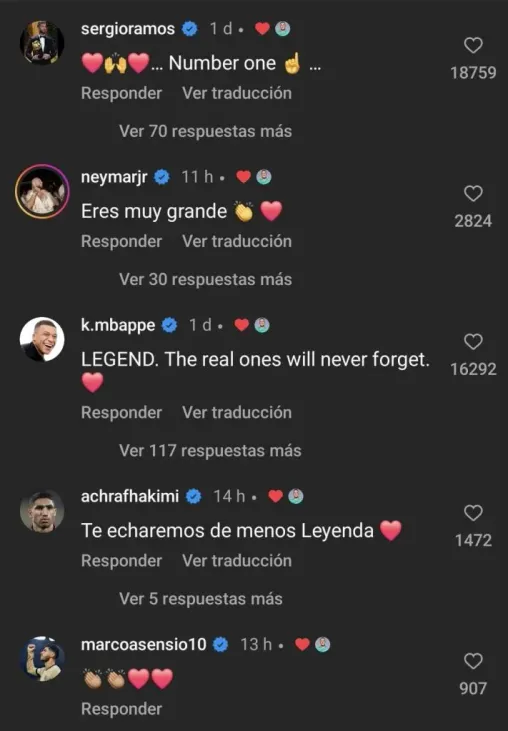 Pero esto no quedó así, porque después otra figura como Neymar también hizo su reacción, así como excompañeros que tuvo en el Real Madrid y con los que coincidió en el PSG como Achraf Hakimi y Marco Asensio.