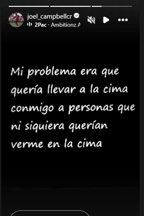 Joel Campbell publicó lo siguiente en sus historias de Instagram: “Mi problema era que quería llevar a la cima conmigo a personas que ni siquiera querían verme en la cima”.