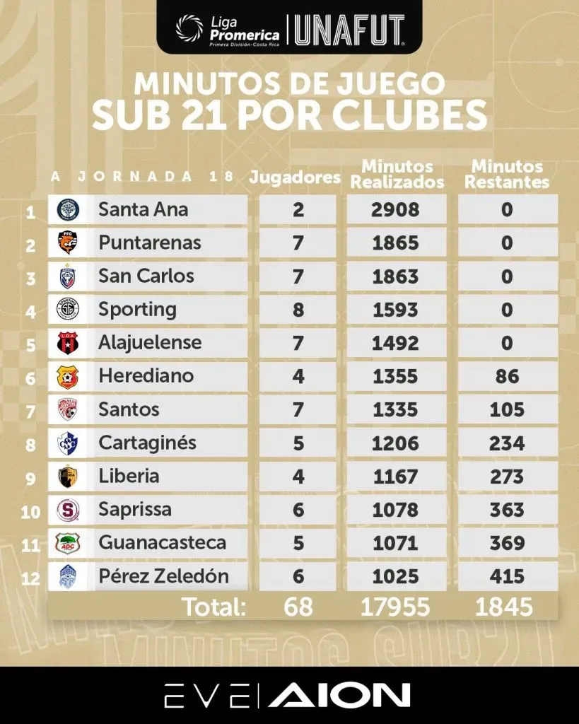 Tomando en cuenta estos números, el Saprissa solamente le ha dado oportunidad a 6 jugadores Sub-21 con 1078 minutos realizados. Muy por debajo de otros equipos como Alajuelense, Herediano, Puntarenas o Santa Ana que lidera esta tabla.
