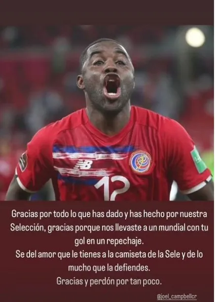 “Gracias por todo lo que has dado y has hecho por nuestra Selección, gracias porque nos llevaste a un mundial con tu gol en un repechaje. Sé del amor que le tienes a la camiseta de la Sele y de lo mucho que la defiendes. Gracias y perdón por tan poco.”