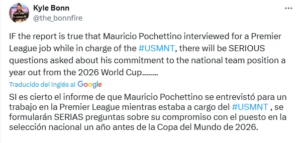 Ante esta noticia, el periodista estadounidense Kyle Bonn, que brinda información del seleccionado de fútbol, aseguró que, si se confirma que esta noticia es cierta, someterán a Pochettino a preguntarle sobre su verdadero compromiso con la Selección de Estados Unidos. A horas de un partido tan importante contra Costa Rica, hay mucha incertidumbre con el técnico argentino.
