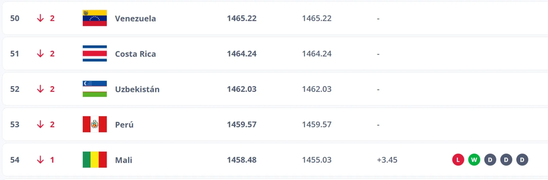 Como consecuencia, selecciones como República del Congo y Camerún lograron escalar posiciones y superaron a Costa Rica, empujando a la Tricolor fuera del top 50 del ranking mundial.