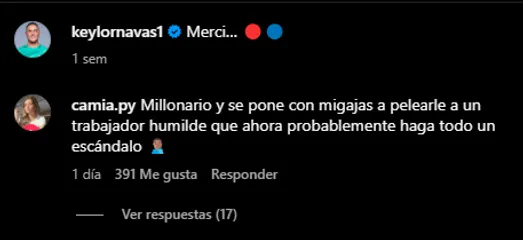 En las últimas publicaciones de Keylor Nabas hubo comentarios muy fuertes en contra el guardameta costarricense tras esta denuncia recibida. Algunos de ellos fueron los siguientes: “Millonario y se pone con migajas a pelearle a un trabajador humilde que ahora probablemente haga todo un escándalo”; “Gracias por renunciar a la sele, no necesitamos más explotadores representando al país”.