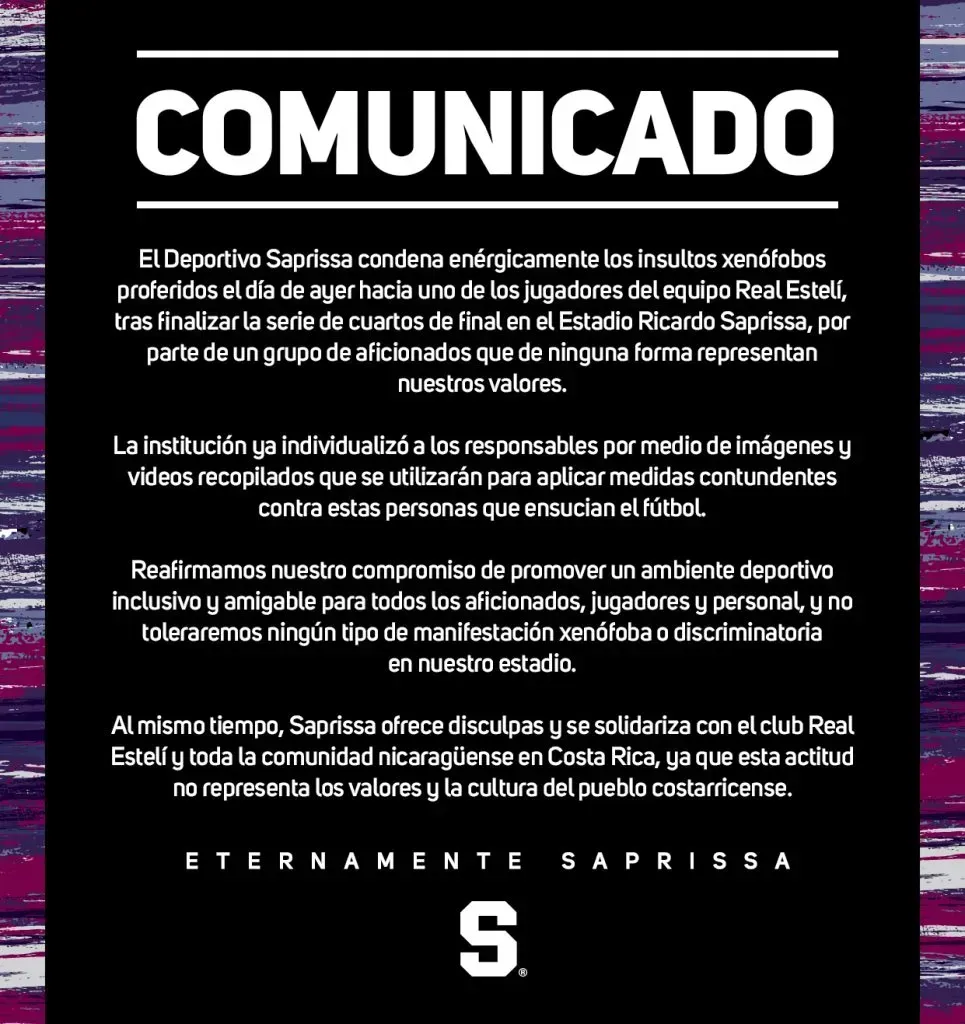 Según el comunicado oficial del club morado: “El Deportivo Saprissa condena enérgicamente los insultos xenófobos proferidos el día de ayer hacia uno de los jugadores del equipo Real Estelí… por parte de un grupo de aficionados que de ninguna forma representan nuestros valores.” Este incidente ha generado una ola de reacciones y ha llevado al club a tomar medidas.