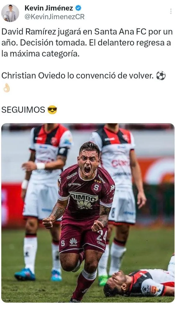 David Ramírez jugará en Santa Ana FC. Así lo adelantó el periodista Kevin Jiménez, detallando a través de sus redes sociales que es una “decisión tomada” y firmará su vínculo por un año con el nuevo inquilino de la Primera División.