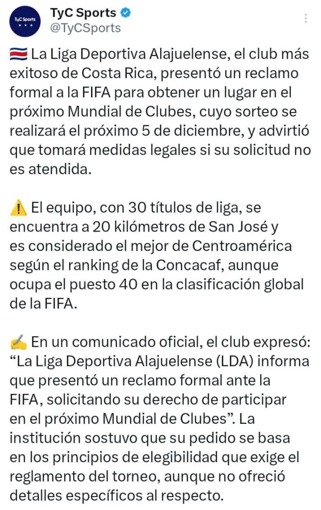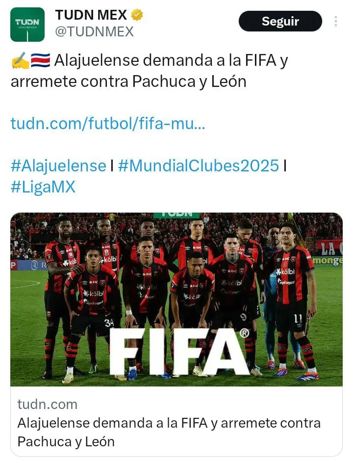 Liga Deportiva Alajuelense está expectante por saber si la FIFA escuchará su reclamo y le permitirá reemplazar a Pachuca o León en el Mundial de Clubes 2025. Pero si no sucede, llevará el caso hasta la última instancia posible: el TAS (Tribunal de Arbitraje Deportivo).