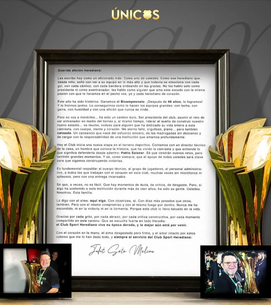 Hoy, ya con el campeonato consumado, el presidente de los Florenses decidió escribir una carta abierta hacia la afición rojiamarilla. En esta, aseguró que se viene una nueva etapa y con nuevos retos para Herediano con Pablo Salazar como entrenador.