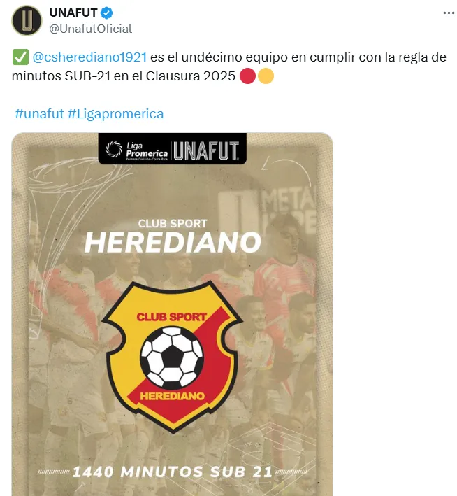Unafut comentó que Herediano “es el undécimo equipo en cumplir con la regla“. El único club que no ha sido capaz de completar el tiempo, hasta el momento, es Cartaginés. Los de Cartago llevan 1437′ y solo necesitan alinear por tres minutos a un Sub-21 en el partido de la última jornada ante Sporting.