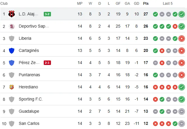 La tabla de posiciones de la Primera División de Costa Rica en la Jornada 14