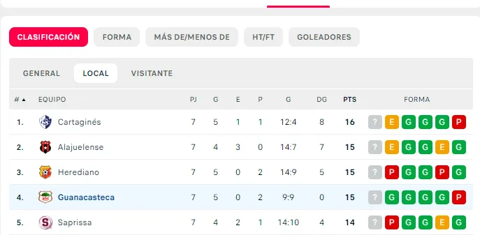 Jugando en casa el Guanacasteca tiene más victorias que el Saprissa que en esta tabla tomando en cuenta solo los partidos de local, los Morados marchan en la quinta posición. Al menos en la previa no pinta como un trámite para José Giacone que además estará haciendo su debut.