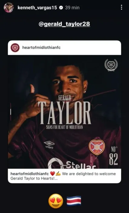 Kenneth Vargas celebró a lo grande la contratación de Gerald Taylor, dándolo a conocer en una historia en su cuenta oficial de Instagram, en el que reposteó la publicación del Hearts y acompañándolo con un emoji de enamorado y otro con la bandera de Costa Rica.