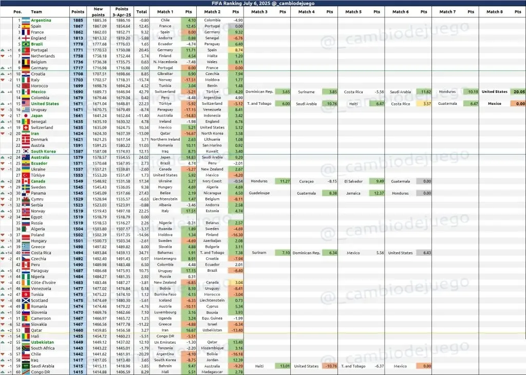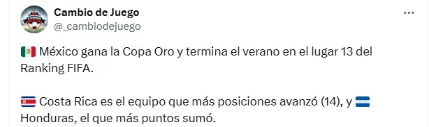 México, además, alcanzará el puesto 13 tras ser el campeón de la Copa Oro. Si no empataba contra Costa Rica, podría haber terminado más arriba. El 0-0 con la Sele le descontó un total de 5 puntos en el ranking.