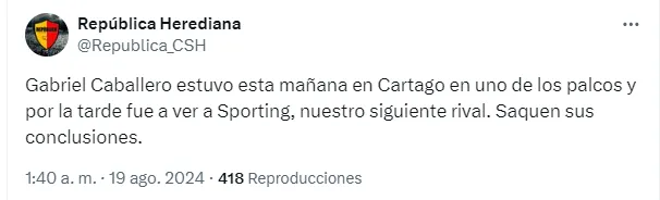 Además, la cuenta República Herediana, que se dedica a seguir las novedades del Team, fue más allá: “Gabriel Caballero estuvo esta mañana en Cartago en uno de los palcos y por la tarde fue a ver a Sporting, nuestro siguiente rival. Saquen sus conclusiones”, escribieron los partidarios.