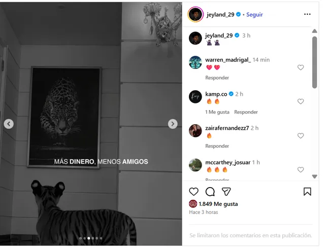 Tras compartir varias imágenes suyas, Jeyland dejó un mensaje en una de estas en las que aparenta estar decepcionado debido al contenido de la frase. “Más dinero, menos amigos”, reza el enunciado.