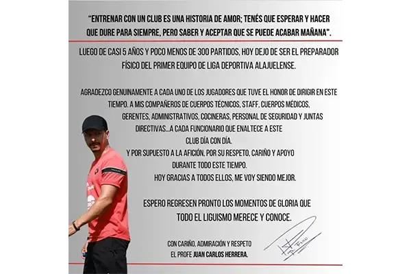 De manera oficial ahora fue el turno de Juan Carlos Herrera, preparador físico del primer equipo de la Liga Deportiva Alajuelense. Herrera publicó una carta de despedida en sus redes sociales. De esta manera, la salida de Herrera se da el mismo día que la de los asistentes técnicos Martín Arriola y Mario Acosta.