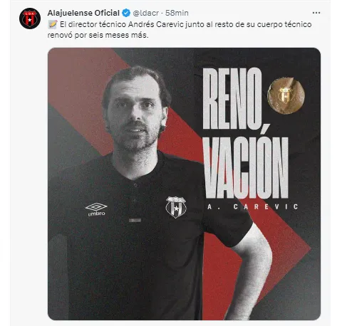 A través de sus redes sociales desde el Departamento de Prensa de la Liga Deportiva Alajuelense manifestaron lo siguiente: “El director técnico Andrés Carevic junto al resto de su cuerpo técnico renovó por seis meses más”, comunicaron.