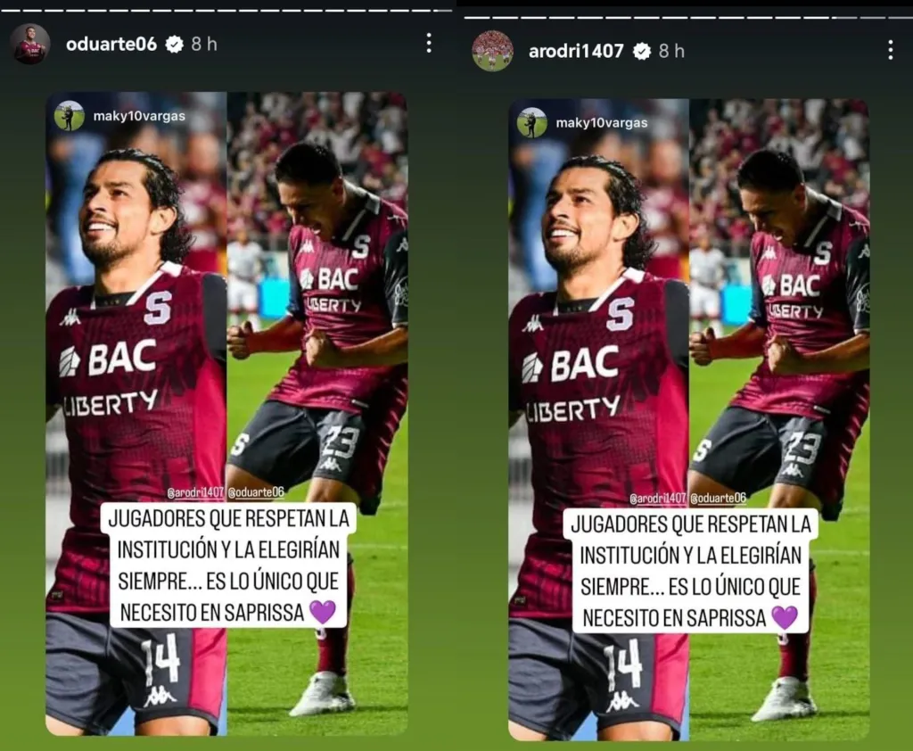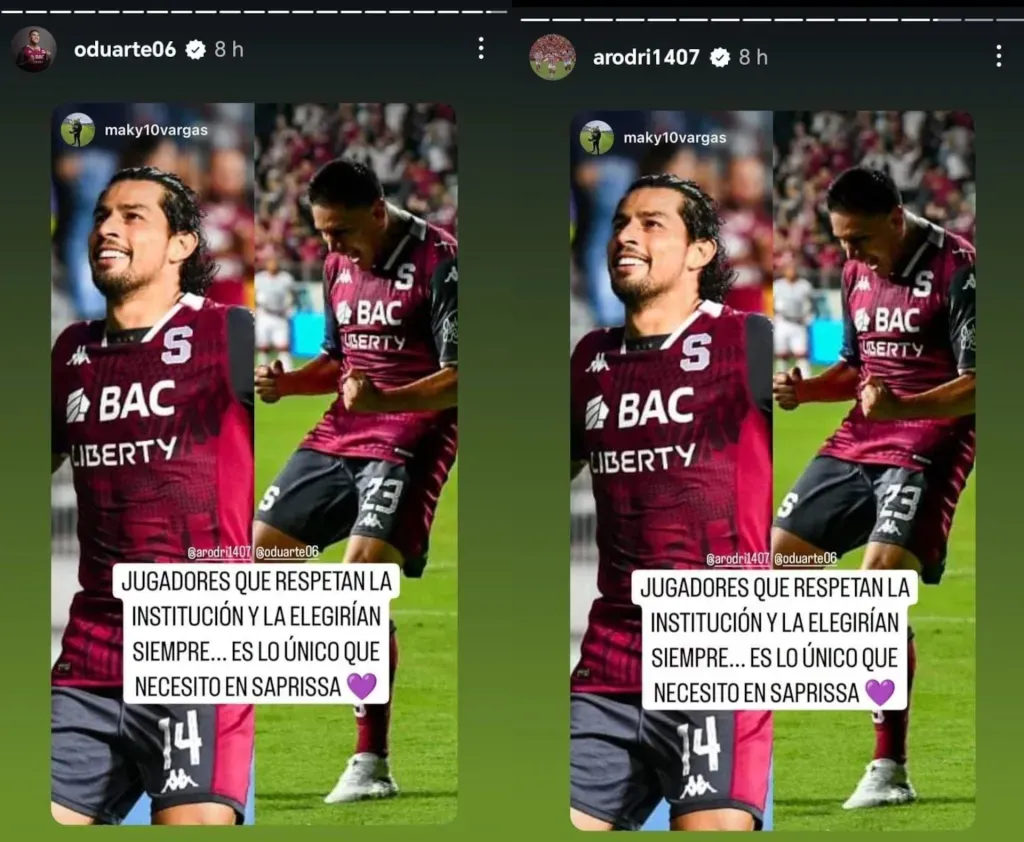 “Jugadores que respetan la institución y la elegirían siempre… es lo único necesito en Saprissa”, reza el posteo, acompañado por fotografías de ambos, que Duarte y Rodríguez compartieron en sus perfiles de Instagram.