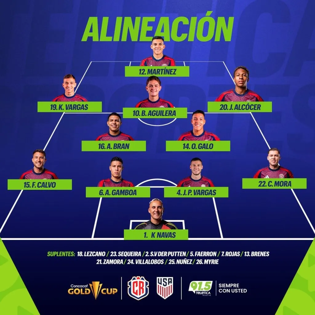 El XI de Costa Rica quedó conformado de la siguiente manera: Keylor Navas en la portería; Francisco Calvo, Alexis Gamboa, Juan Pablo Vargas y Carlos Mora en la defensa; Alejandro Bran y Orlando Galo en el mediocentro; Josimar Alcócer y Kenneth Vargas por las bandas;Brandon Aguilera de mediapunta; y Alonso Martínez como referencia ofensiva.